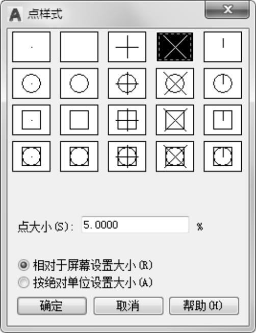 (2)设置点样式。选择菜单栏中的“格式”→“点样式”命令,在打开的“点样式”对话框中选择X样式,如图2-57所示。