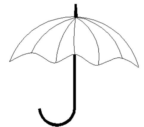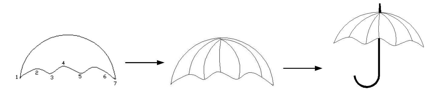 本实例利用“圆弧”与“样条曲线”命令绘制伞的外框与底边,再利用“圆弧”命令绘制伞面辐条,最后利用“多段线”命令绘制伞顶与伞把,绘制流程如图2-71所示。