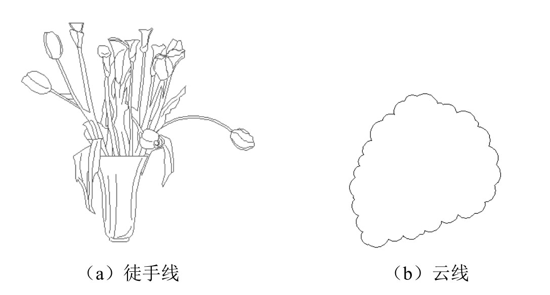 徒手线和云线是两种不规则的线。这两种线正是由于其不规则和随意性,给刻板规范的工程图绘制带来了很大的灵活性,有利于绘制者个性化和创造性的发挥,更加接近于现实世界,如图2-76所示。