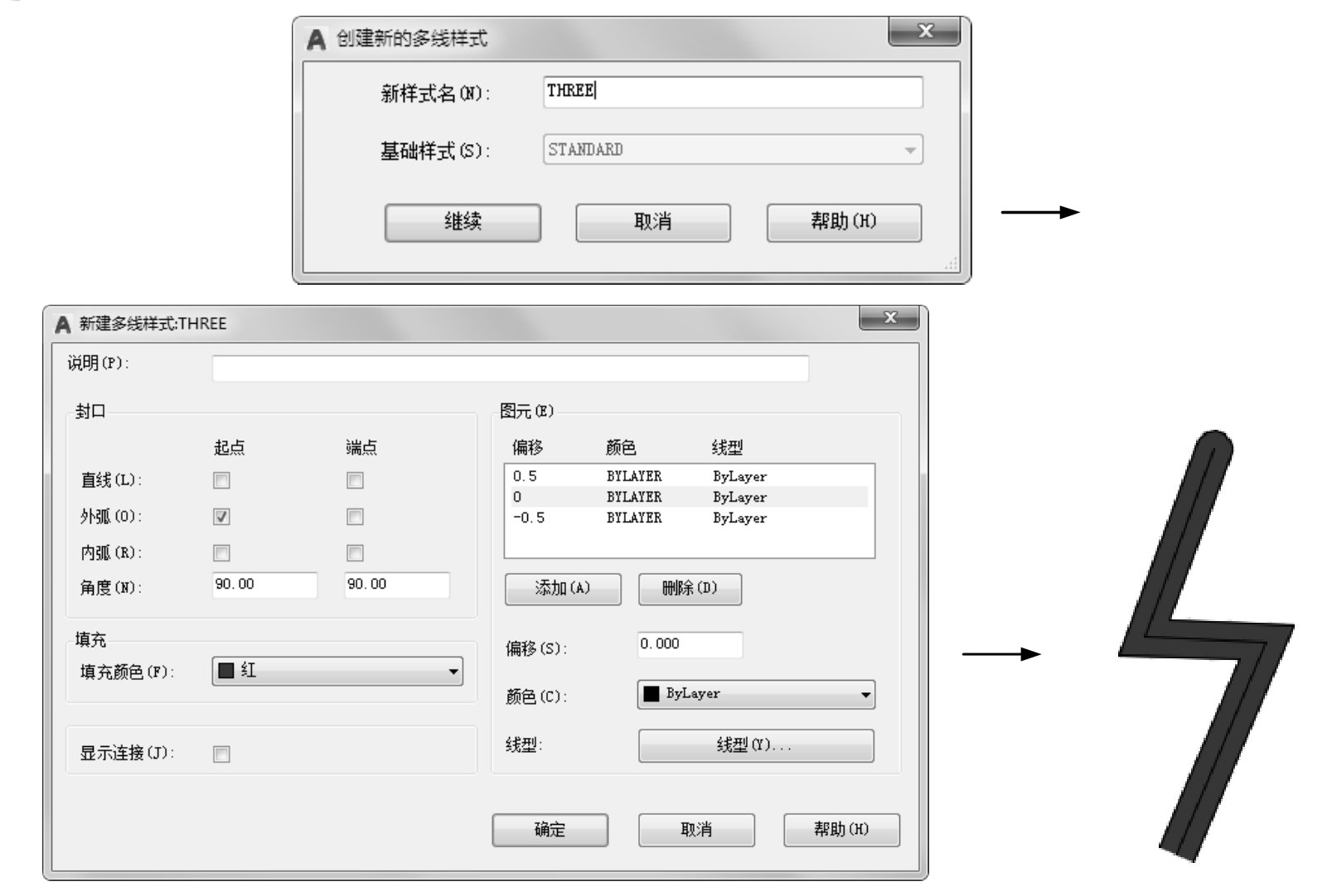 利用“多线样式”命令打开“多线样式”对话框,然后设置参数并绘制,过程如图2-79所示。