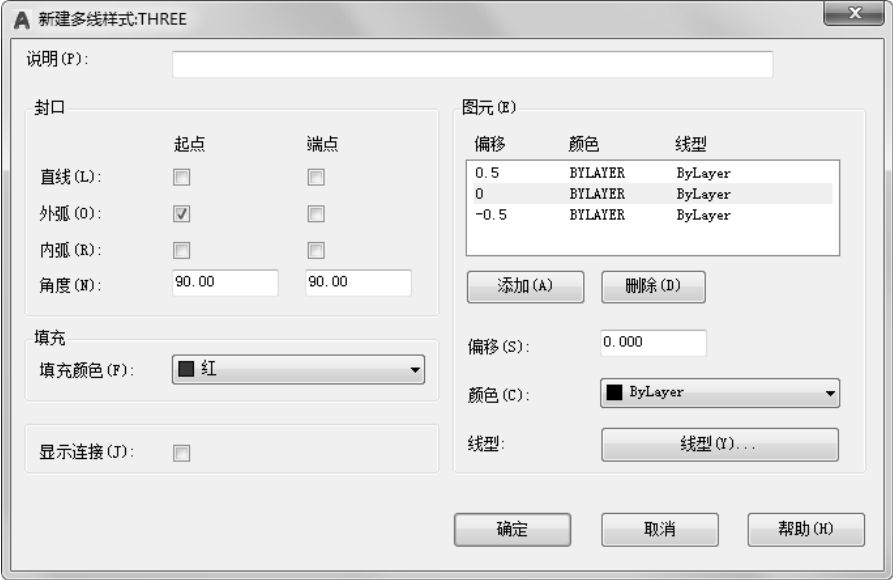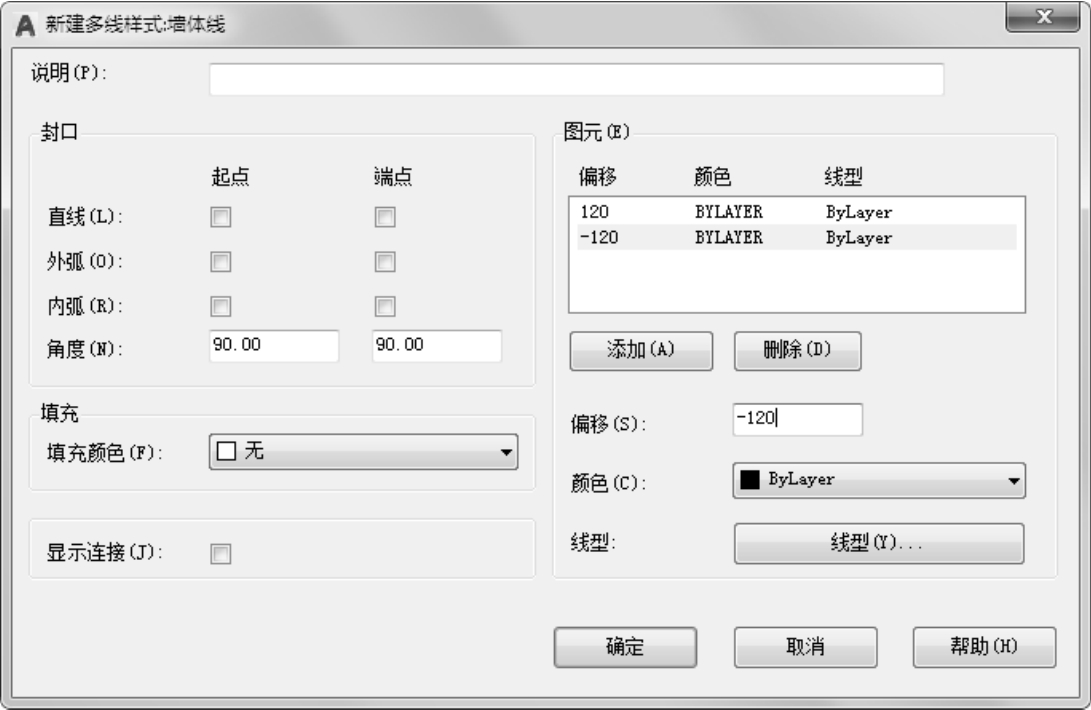 (6)在“图元”选项组中可以设置组成多线元素的特性。单击“添加”按钮,可以为多线添加元素;反之,单击“删除”按钮,可以为多线删除元素。在“偏移”文本框中可以设置选中元素的位置偏移值。在“颜色”下拉列表框中可以为选中的元素选择颜色。单击“线型”按钮,可以为选中元素设置线型。