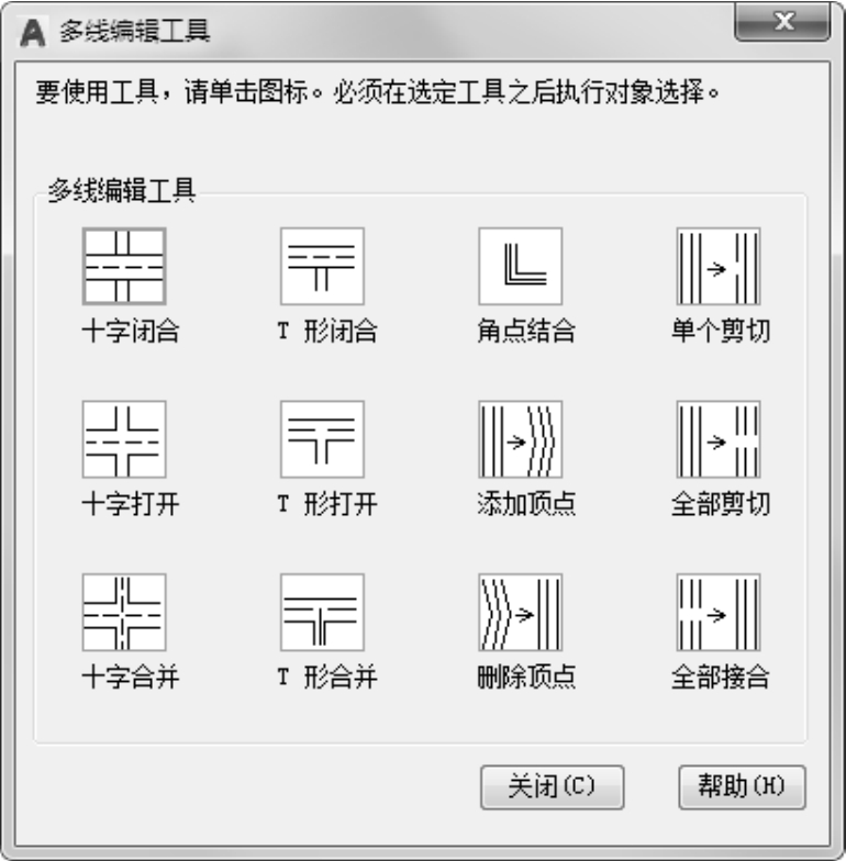执行该命令后,打开“多线编辑工具”对话框,如图2-82所示。利用该对话框可以创建或修改多线的模式。该对话框中分4列显示了示例图形。其中,第1列管理十字交叉形式的多线,第2列管理T形多线,第3列管理拐角接合点和节点,第4列管理多线被剪切或连接的形式。选择某个示例图形,即可调用该项编辑功能。