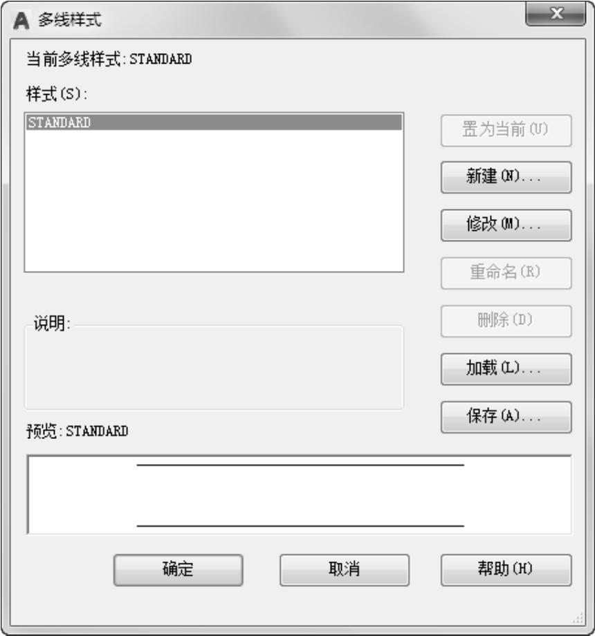(1)选择菜单栏中的“格式”→“多线样式”命令,打开“多线样式”对话框。