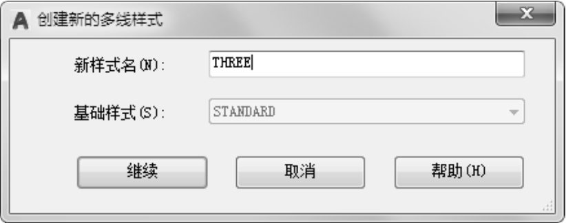 (3)选择菜单栏中的“格式”→“多线样式”命令,打开“多线样式”对话框,在其中单击“新建”按钮,打开“创建新的多线样式”对话框,在“新样式名”文本框中输入“墙体线”,单击“继续”按钮。
