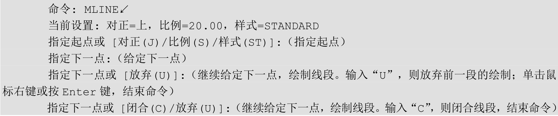 指定起点:执行该选项后(即输入多线的起点),系统会以当前的线型样式、比例和对正方式绘制多线。默认状态下,多线的形式是距离为1的平行线。