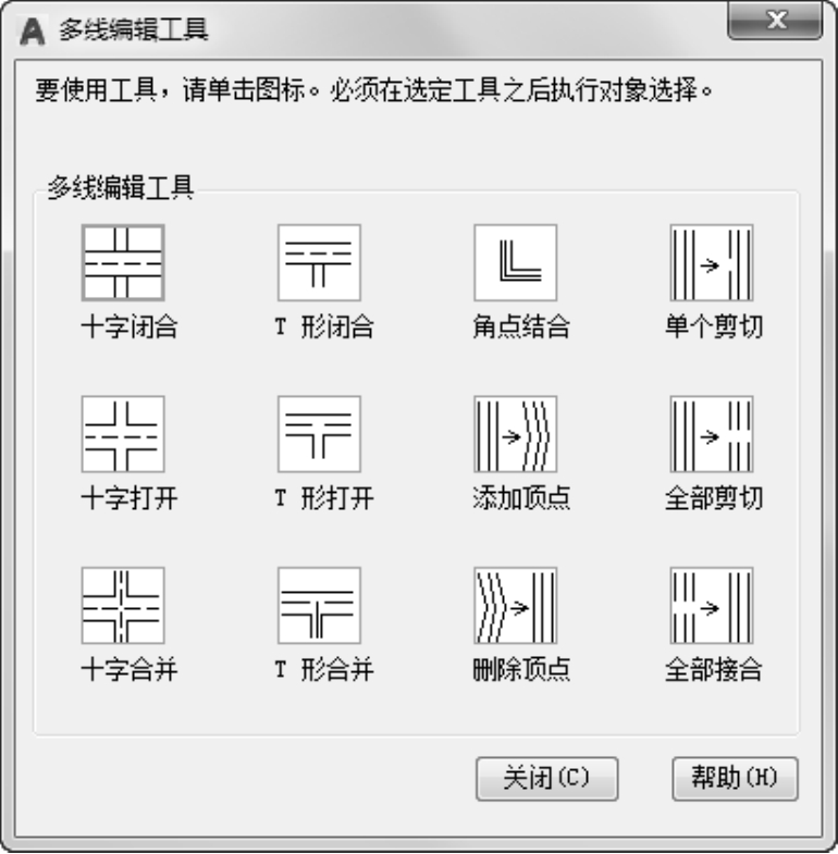 (6)选择菜单栏中的“修改”→“对象”→“多线”命令,打开“多线编辑工具”对话框,如图2-90所示。选择其中的“T形打开”选项,确认后,命令行中的提示与操作如下: