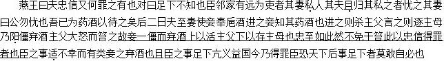 答: 燕王曰:“夫忠信,(可不加标点)又何罪之有也?”对曰:“足下不知也。(感叹号亦可)臣邻家有远为吏者,其妻私人。其夫且归,其私之者忧之。其妻曰:‘公勿忧也,吾已为药酒以待之矣。(感叹号亦可)’后二日,夫至,(句号亦可)妻使妾奉巵酒进之,(句号亦可)妾知其药酒也,进之则杀主父,言之则逐主母,乃阳僵弃酒。主父大怒而笞之。故妾一僵而弃酒,上以活主父,下以存主母也。忠至如此,然不免于笞,(感叹号、句号亦可)此以忠信得罪者也。(感叹号亦可)臣之事,适不幸而有类妾之弃酒也。(感叹号亦可)且臣之事足下,亢义益国,今乃得罪,(句号亦可)臣恐天下后事足下者,莫敢自必也。”(感叹号亦可)
