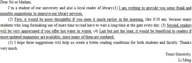 本题要求考生写一封建议信给学校图书馆管理员,以帮助他们改善图书馆的服务质量。话题比较贴近实际生活,可写的点很多,比如:开关门的时间,更新书库等。但总体来说应包括三部分内容:引出话题(表明写信目的);提出建议;希望自己的建议能够有所帮助。行文的重点应当放在提建议上,从各个角度入手提出合理切实的意见,文章的另外两个部分则尽量简洁明了为好。