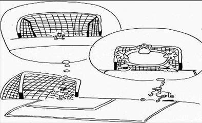 (1) Thiscartoon presents a very sharp conflict between two rivals, the goalkeeperand the ball striker of a football game. The former worries that he is toosmall to block the ball, while the striker thinks the goalkeeper is so largeconstructed that he is incapable of kicking the ball in. (2) In fact, bothof them are just normally sized. They minimize themselves and exaggeratethe opponent just because they are lack of self-confidence.