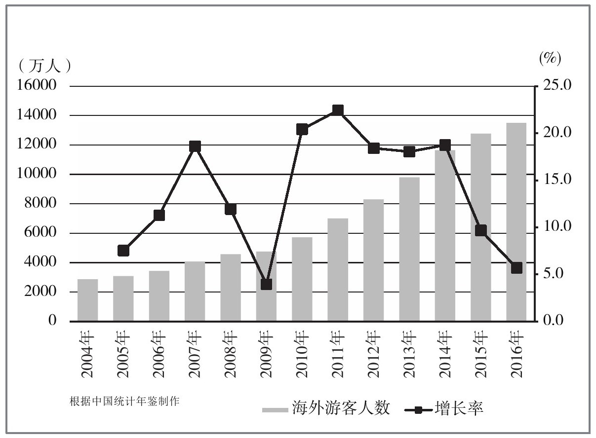 1998年去海外旅游的中国游客总数达到843万人次,2016年这个数字变为1.35亿人次,增长了15倍。据推算中国游客海外旅游的消费额达到了2920亿美元,远远超过美国和德国,居世界第一。图4是以2004年为基准(数字100)显示的中国国内旅游人数和出境游客人数的对比。近年来,出境游的人数超过了国内旅游的人数。