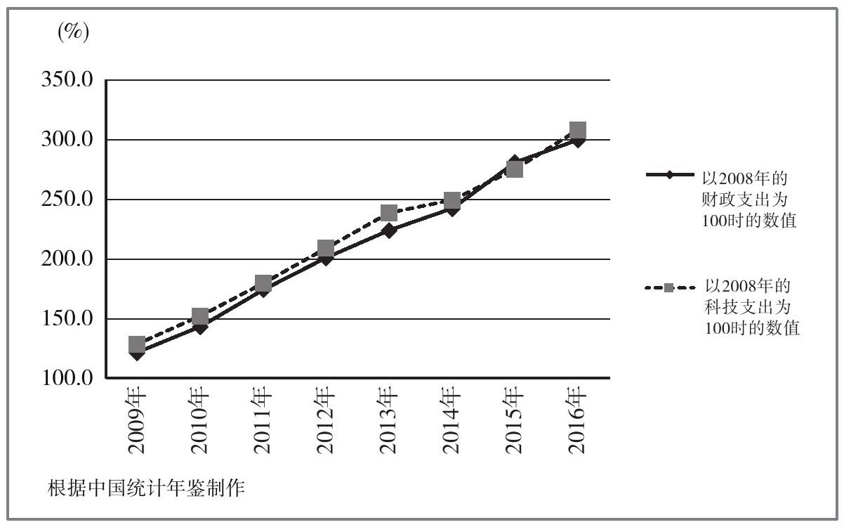图6 财政支出额和科学技术支出额的指数(以2008年为100的指数)