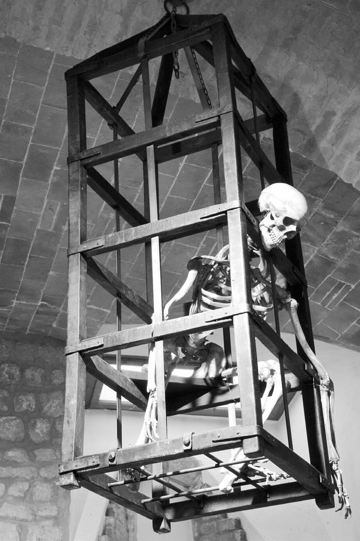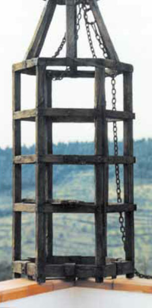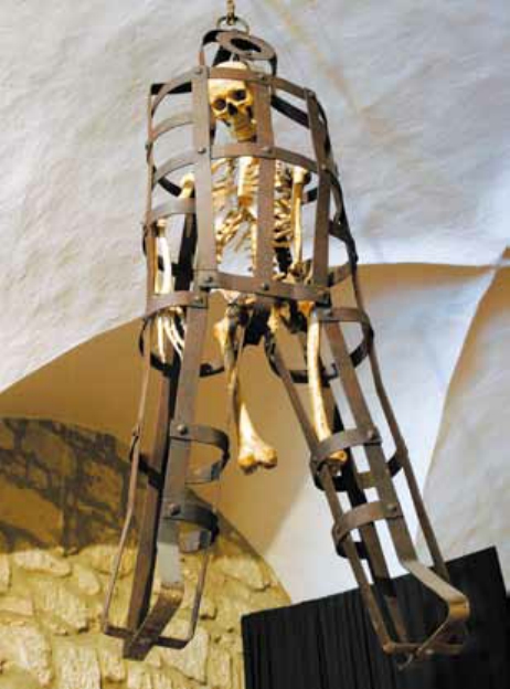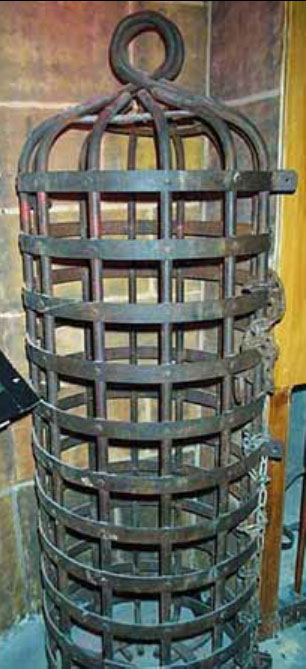 3个不同的铁笼。它们更准确地应被称为“吊笼”,尽管这个称呼多少会与绞刑架相混淆,且早期的断头机有时候也称吊笼。无论装载尸体公开示众,还是把活着的受害者锁在里面让其死于暴晒,这类奇观都助长了这些刑具的使用。