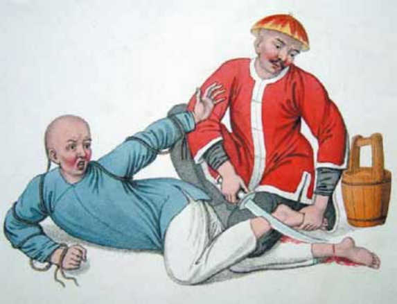 上图是一种在东方国家经常采用的刑罚。从图中可以看到一次使人变跛的行刑场景,受害者的跟腱被割断,这样他就不能行走或站立。这一刑罚可能施加在企图逃跑的奴隶身上(至于一个不能站立的奴隶还有什么用,就不得而知了)。