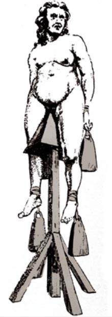 犹大尖凳(Judas Cradle)可怕的行刑过程,从中世纪到现如今在实质上依然没有改变。如图(上页的下图)所示,受害者被吊起来,身体被置于凳子的锋利尖端上。这个尖端可以置于肛门处、阴道里、阴囊下或者尾椎下面。