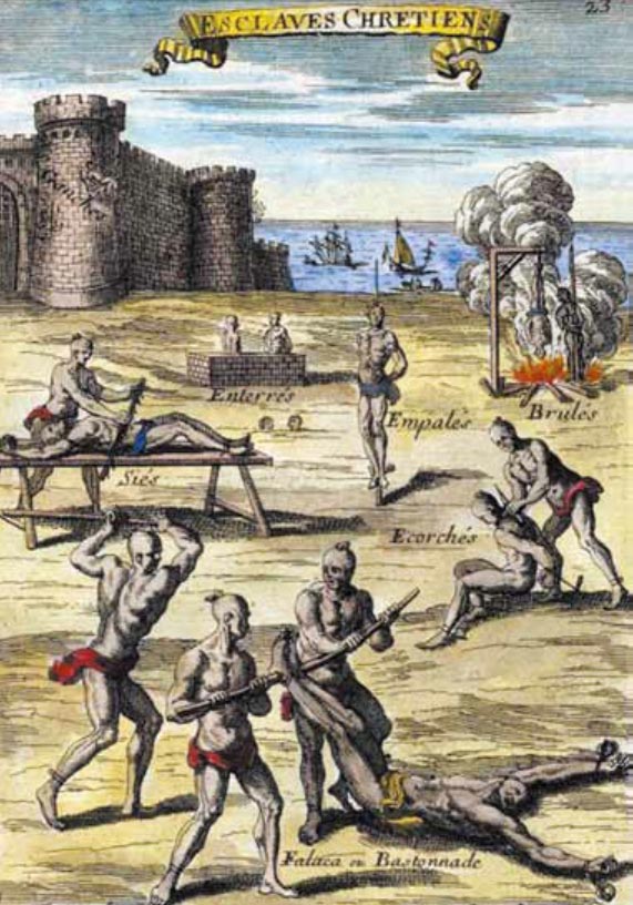 上图描绘的是“原始的种族”采用的野蛮酷刑。该图是典型的宣传画,用来强调和支持西欧人从16和17世纪开始的殖民扩张政策。具有讽刺意味的是,图中所谓的“野蛮”证据的诸多酷刑其实在欧洲同样能够找到。从图中可以看到锯刑、刺刑、火刑、活埋、割掉眼睛或耳朵、笞蹠刑(鞭打脚底)。