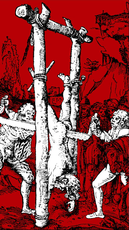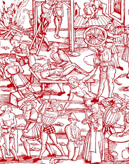 上图——卢卡斯·克拉纳赫(Lukas Cranach)于1548年创作一幅木刻画——和下一页的图片清楚地展现了这一酷刑的实施。