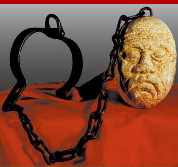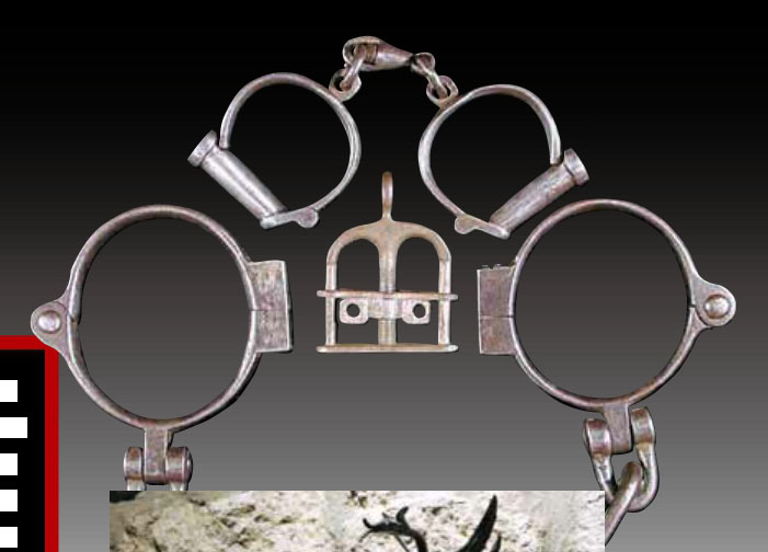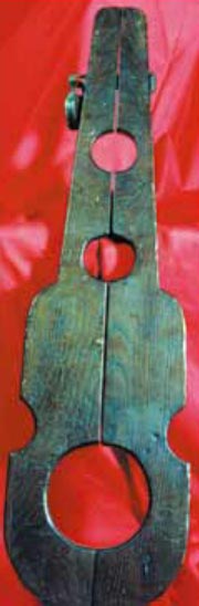 上图:有很多式样的镣铐用来把重物绑在人身上:脚镣、臂铁、腰带以及各种各样的项圈。图中是一个奇特的石球和铁链的组合。被锁进这个铁项圈中的犯人,将被迫长时间携带着这个重物,时间可长达几周、几年甚至整个后半生。这个奇特的石头重达27磅(超过12公斤)。
