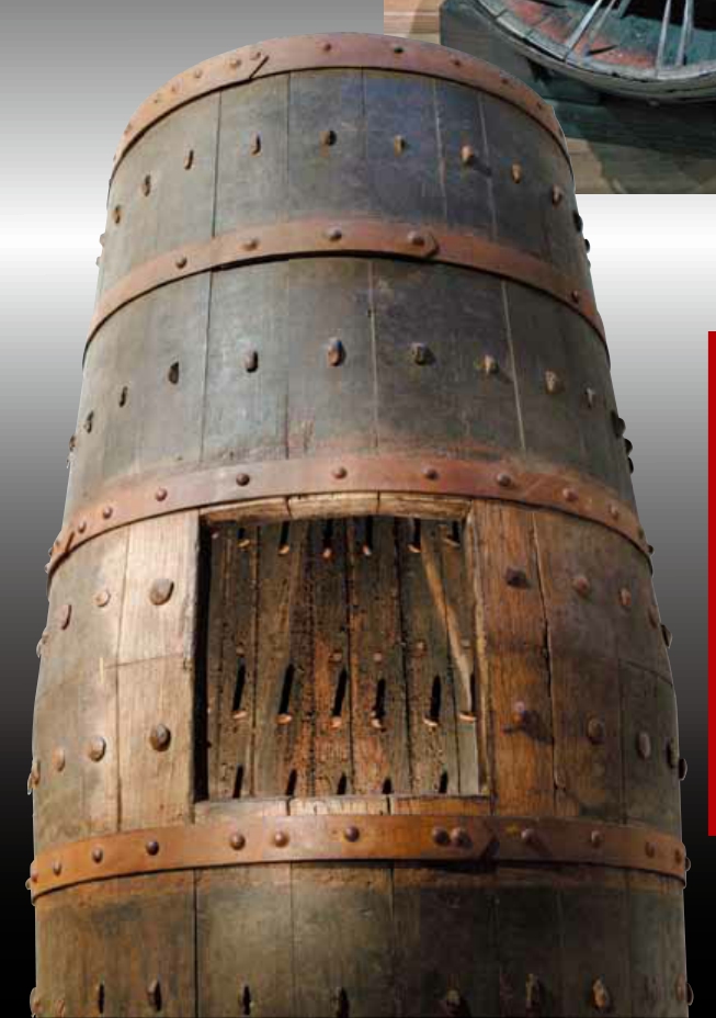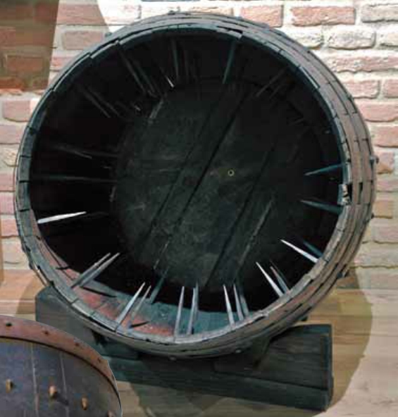 这种钉桶的惩罚相当简单直接。受害者被剥光衣服,然后被强塞进内壁有几百根尖钉的大桶里(就像图中所描绘的)。然后把大桶密封,滚下山,或者在城镇里滚动,甚至被扔进大海,在海浪中颠簸滚动,撞击在海岸上。很明显,经受这种折磨的受害者毫无生还的希望。