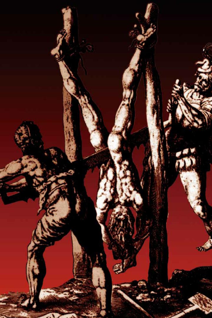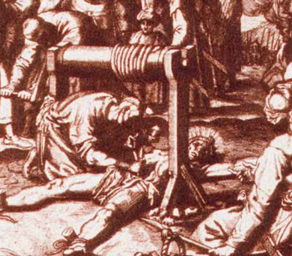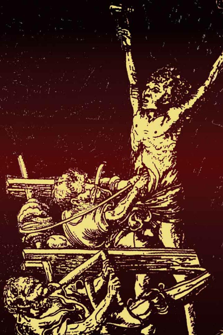 上图:描述的是掏出内脏的情景。受害者被牢牢地固定住,然后在其小腹或胃部割开一个小口,把他的内脏绑在绞盘上。这个恐怖的过程进行得缓慢而小心,目的是在他最终死亡之前,尽可能地延长处决过程。早期基督教的几个殉道者似乎就受到这一酷刑的折磨。