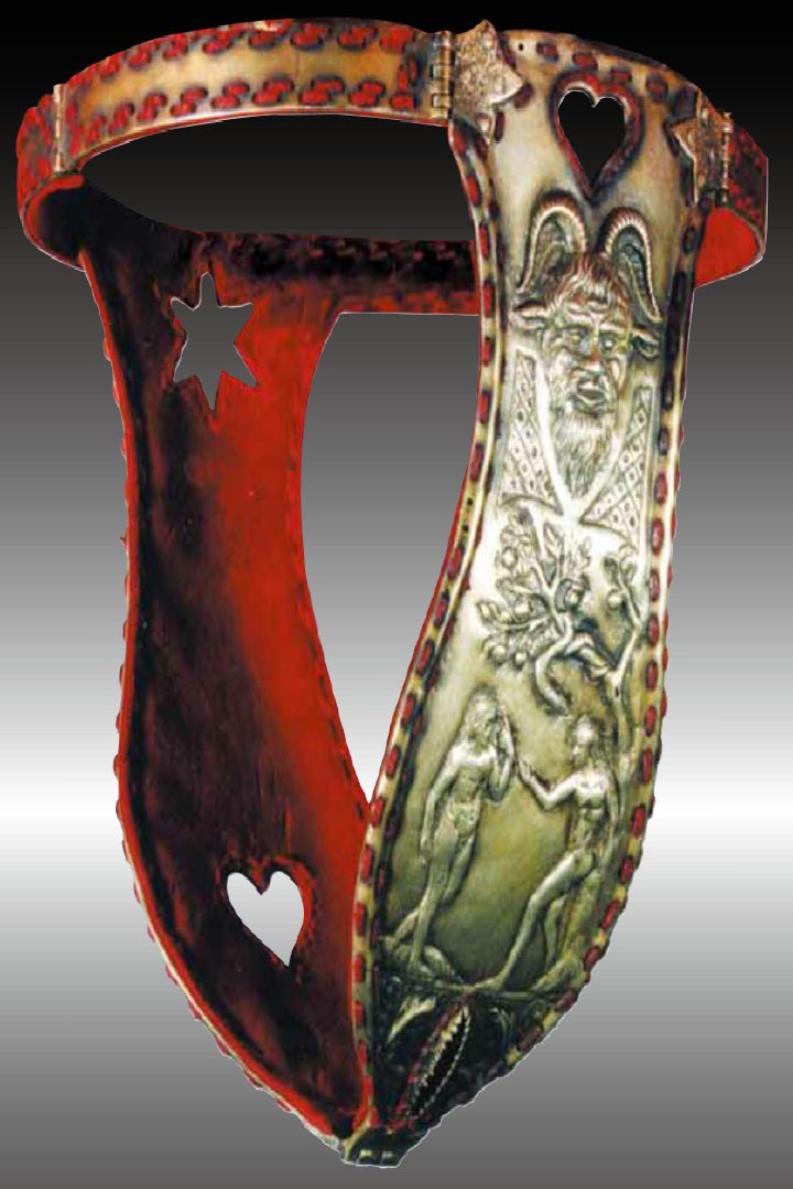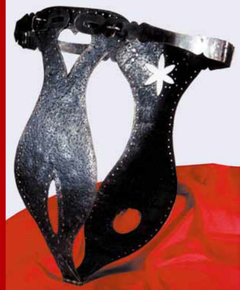 这里有一个相当引人注目的工艺品。贞操带是否被锁在女人们身上,由那些担心她们忠诚的男人们或者为了免遭强奸的妇女们自己决定,这关系到这些装置能否被归入酷刑的类别中。但是,不论你持何种解释,都不能不惊叹它设计之精巧和镀金的工艺水平之高超。