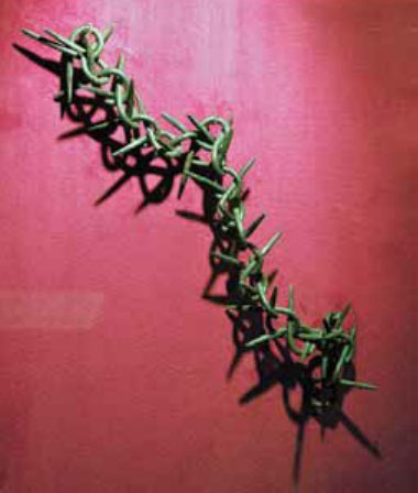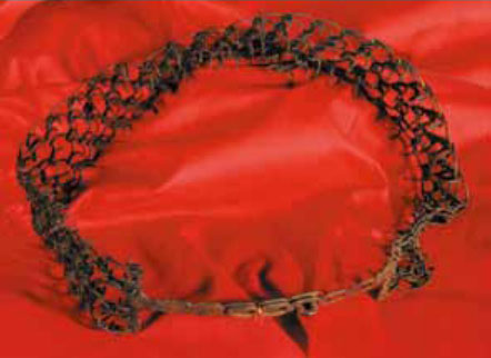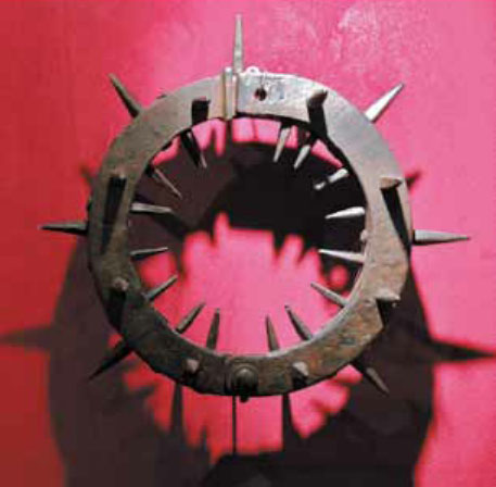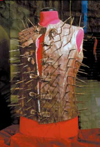 这个刑具(左上图),每一面都布满了尖钉,它重达11磅(5千克)多,一旦锁绕在受害者的脖子上,能够持续地磨损脖子、肩部和下巴上的肉,直至伤及骨头。感染、生坏疸、化脓以及最后骨头(特别是暴露在外的脊椎)的腐烂,会致人死亡。带刺的项链(右上图)可以导致相似的后果。在右下图中,可以看到一种“戒律带”(Cilice Belt)。虽然施刑人曾经使用它折磨受害者,但更常见的用法是那些苦修者施加在自己身上。不论戴在上身还是绕在大腿或者手臂,内侧布满尖钉(该图中的有222根)的这些刑具曾经,且如今依然在一些圈子中受到宗教苦修者的青睐。左下图是一件带刺的外套。它不仅可用作一种惩罚,在一些地区,施刑人和刽子手自己也会穿着这样的衣服;这肯定是为了保护自己,以免遭到受害者的反抗攻击。
