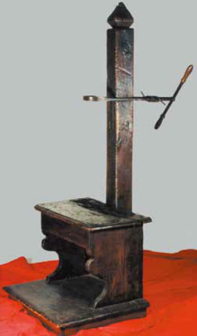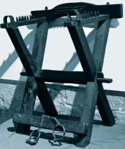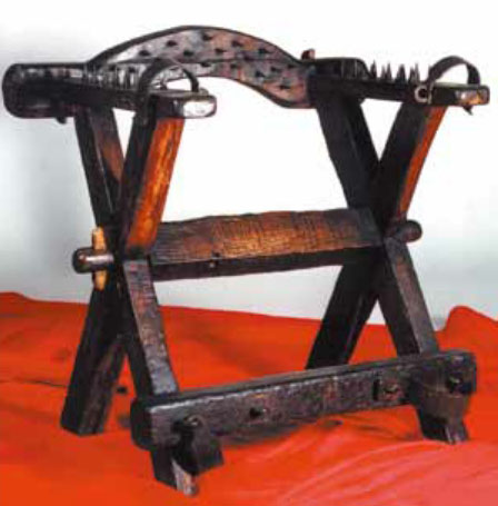这个装置,有时候被称为“王座”,是一个类似于颈手枷的椅子,目的是固定住受害者的双脚,令其倒立。正如我们在弗朗西斯科·戈雅的这幅图中(页左)看到的,受害者一旦被锁在上面,通常会受到鞭打(请注意该图左边阴影中的行刑人),或者把水灌进他嘴里,令其窒息(图中可以看到一个水罐)。另外,在审讯过程中,会有一个审讯员(中间那个人),还有一个记录受害者所说每句话的书记员。这个刑具受到一些地区的审讯人员的青睐,因为他们的法律只允许对受刑者进行一次酷刑折磨。如果使用这个刑具,他们会宣称,他们只进行了一次折磨——尽管一次可能持续了几周。倘若小心施刑,这种令人痛苦的酷刑不仅是不致命的,而且还不会在受害者身上留下明显的伤痕。