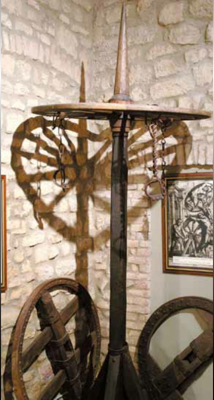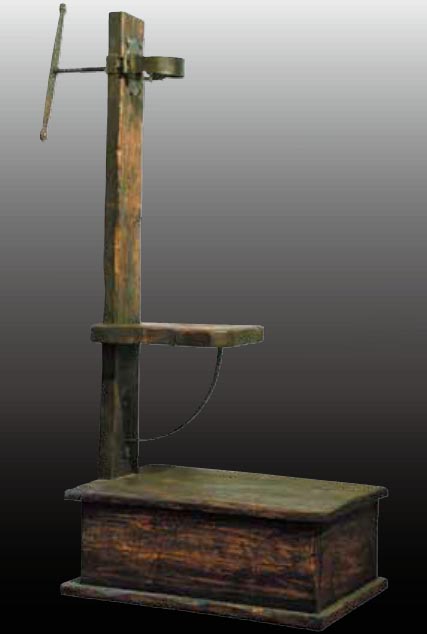 这里有传说中的两种绞刑架。第1种是西班牙绞刑架,刑架上的螺杆可以收紧铁项圈,勒住受害者,令其窒息而死。第2种是加泰罗尼亚绞刑架,不同之处在于,它有一根铁钉来刺穿和压碎颈椎骨,与此同时,它能够压迫整个颈部,铁项圈可以粉碎气管,从而使受害人死于窒息和脊髓神经的损伤。这种痛苦的折磨持续多长时间,取决于刽子手的想法。必须记住的是,绞刑是一种公共奇观,围观民众不会满足于快速的处决。