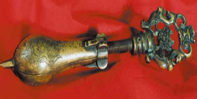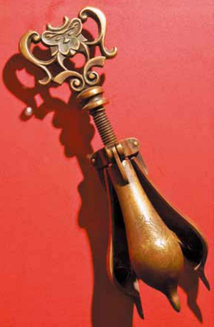这种刑具有一个好似无害的名字“开花梨”,但是实际上这个可怕的刑具非常残忍。机械原理(很清楚地展示在下面两张图中)是转动花纹手柄,令梨的“花瓣”开放,并且只有反转螺母装置才能令其缩回去。把这个“开花梨”插入受害者的阴道或肛门,随后撑开,能够造成很可怕的后果,甚或把其塞入受害者口中,然后打开,直到牙齿碎裂,下巴脱臼。它被精心设计和制作成精美巧致的形状,而背后却隐藏着阴暗和邪恶的念头。