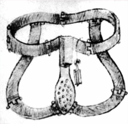在西方世界中第一次提到贞操带(Chastity Belts),是在康拉德·凯泽尔·冯·埃赫施塔特的《战争防御工事》(Bellifortis,公元1400年左右)中,书的主要内容是关于那个时代的军事技术。书中有一幅图(见页末),还附有一句拉丁文:“佛罗伦萨的妇女们就像这样被禁锢在一条沉重的铁带里。”