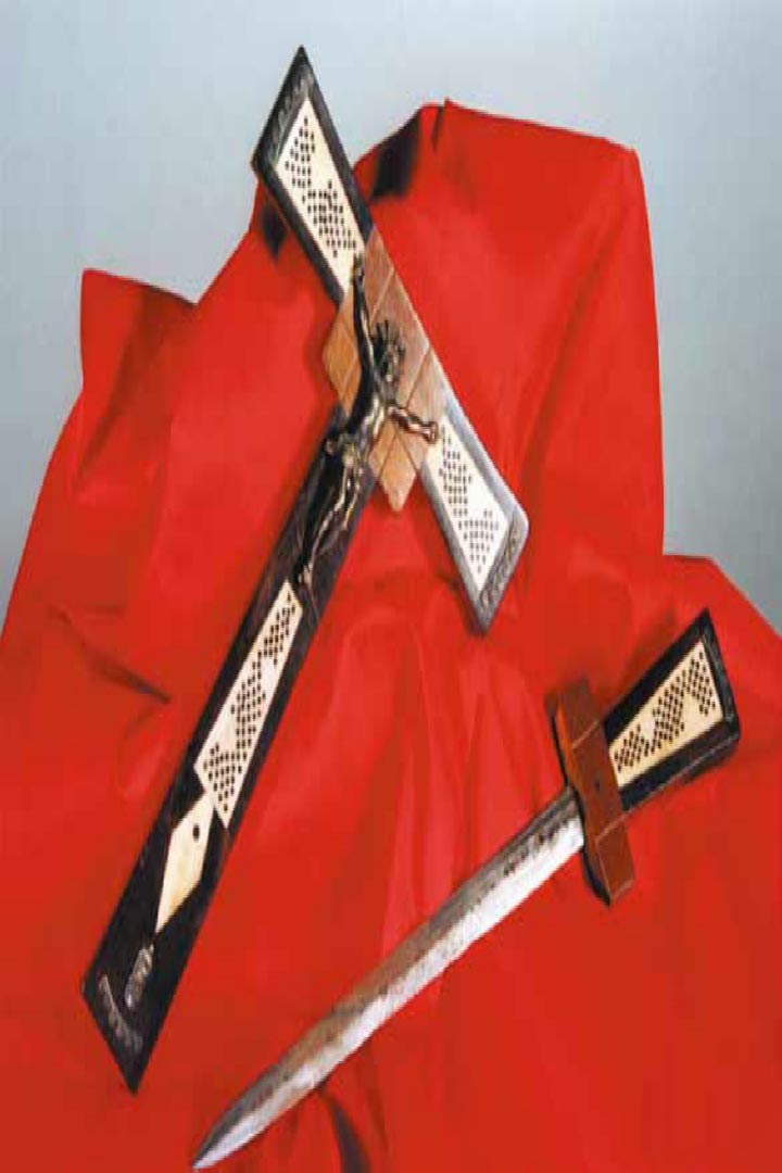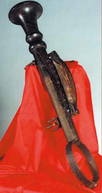 上图:内藏一把短剑的十字架。这个刑具可能是用来救赎和杀死一个异教徒,他或许在宗教审判大会上由宗教裁判所官员公开地处决。如果受刑人宣布放弃“错误的信仰”并拥抱十字架,宗教审判官或许会怜悯他,用短剑痛快地杀死他,而不是让他在烈火中缓慢痛苦地死去。