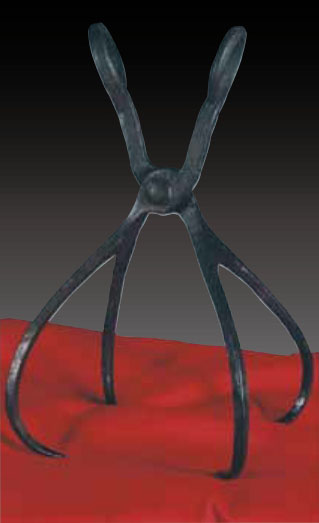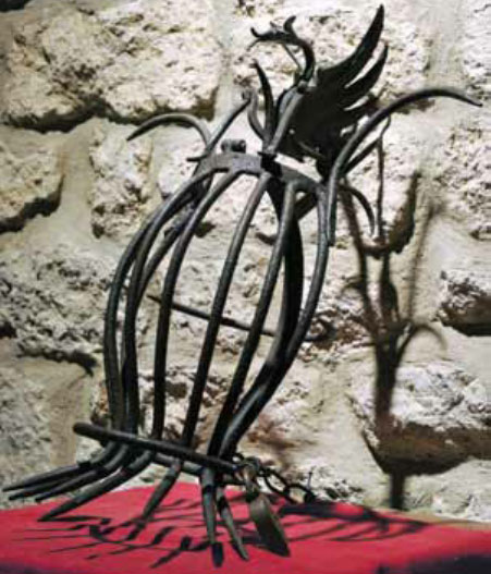 上图:这个工具被称作“女巫蜘蛛”(Witch's Spider)和“西班牙蜘蛛”(Spanish Spider)。这些有4个尖爪、剪刀柄的钳子是酷刑室的基本工具。它们,不论是烧的通红还是冰凉的,都能够把受害者钩起来,一般勾住臀部、乳房、腹部,或者头部(通常是用两个尖爪勾进耳朵或眼睛里)。在现在的第三世界国家中,依然可以发现它们的踪影,特别是在对女性的审讯中。
