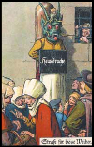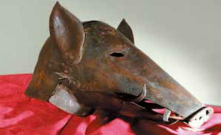 这里显示了五花八门、奇特的口钳。从左上角开始按顺时针方向依次是:一个嘴巴封着的驴面面具;一个野猪头形状的面具;一个形似国王或教皇的面具;一个驴或羊头状的口钳。中间的图片是一张德国明信片,描绘的是一个受到公开羞辱的泼妇,被戴上了“河东狮吼”的口钳。