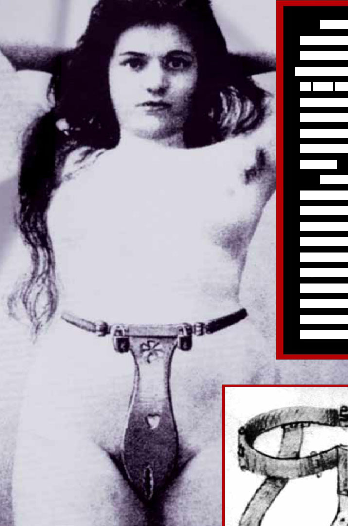 “贞洁带”(Girdle of Purity)、“处女腰带”(Girdle of Venus)、“佛罗伦萨带”(Florentine Girdle):在这个装置的众多名字中,最为大家熟知的是贞操带。腰带所造成的痛苦比预想的要严重得多。右边这幅图描绘了一种设计形式,它的前面(阴道处)所开的一个孔非常小,为的是可以让人小便,除此之外即使很小的物体都难以进入。但是,上图右边的那个装置,留着一个很大的孔,只是上面布满了非常锋利的铁刺。