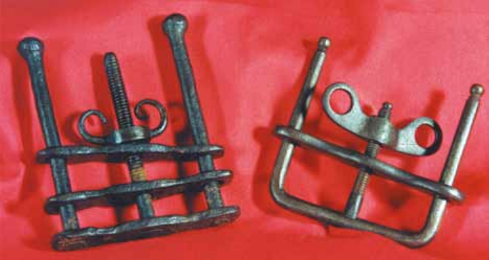 在下面是保存完好的两种拇指夹。右边的那个拇指夹上面有一个铁环,可以连接在束缚器械上,左边的这两个可能是专为施加疼痛而设计的。
