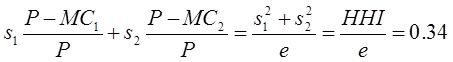 (3)若赫芬达尔指数为s 1 2 +s 2 2 =0.68,则行业的价格加成率为: