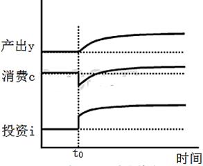 图2表示,当经济从资本少于黄金律水平开始,并且储蓄率提高时,随着时间的推移,产出、消费和投资发生了变动。储蓄率的提高(在时间t 0 )导致了消费的立即减少和投资的等量增加。在一段时间内,随着资本存量的增加,产出、消费和投资同时增加。由于经济以资本少于黄金律为开始,新的稳定状态比初始稳定状态的消费水平高。