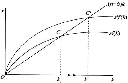 图中,经济最初位于C点的稳态。现在假定储蓄上升了,从s增加到s′,这使储蓄曲线上移至s′f(k)的位置。这时新的稳态为C′,比较C点和C′点,可知储蓄率的增加提高了稳态的人均资本和人均产量。