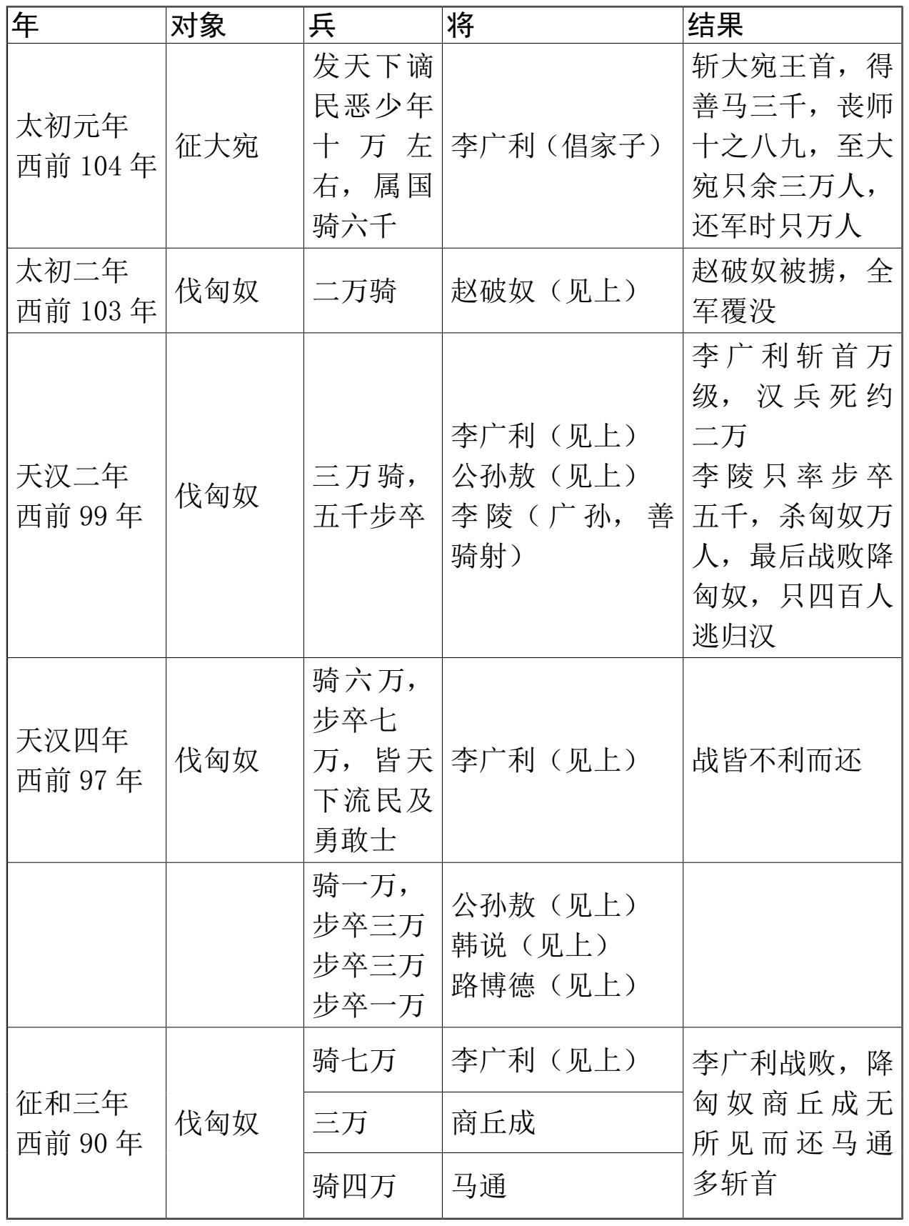 (4)战争的结果大半靠将才。卫青与霍去病二人从未打过败仗,每次都是大胜。李广利个人虽武艺高强,将才甚为平庸,所以总是打败仗,或需重大的代价才能求得小小的胜利,如伐大宛的一次。这也是兵制破裂的间接证据。当时的边族无论人力、财力都远在中国之下。文帝时,中国投降匈奴的中行说劝诫单于说: