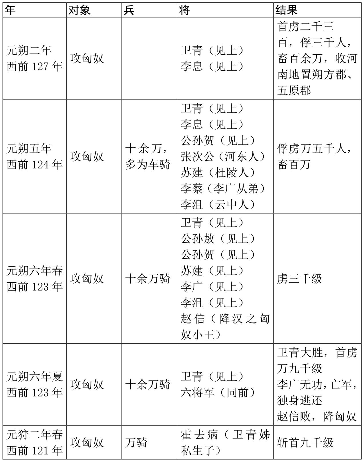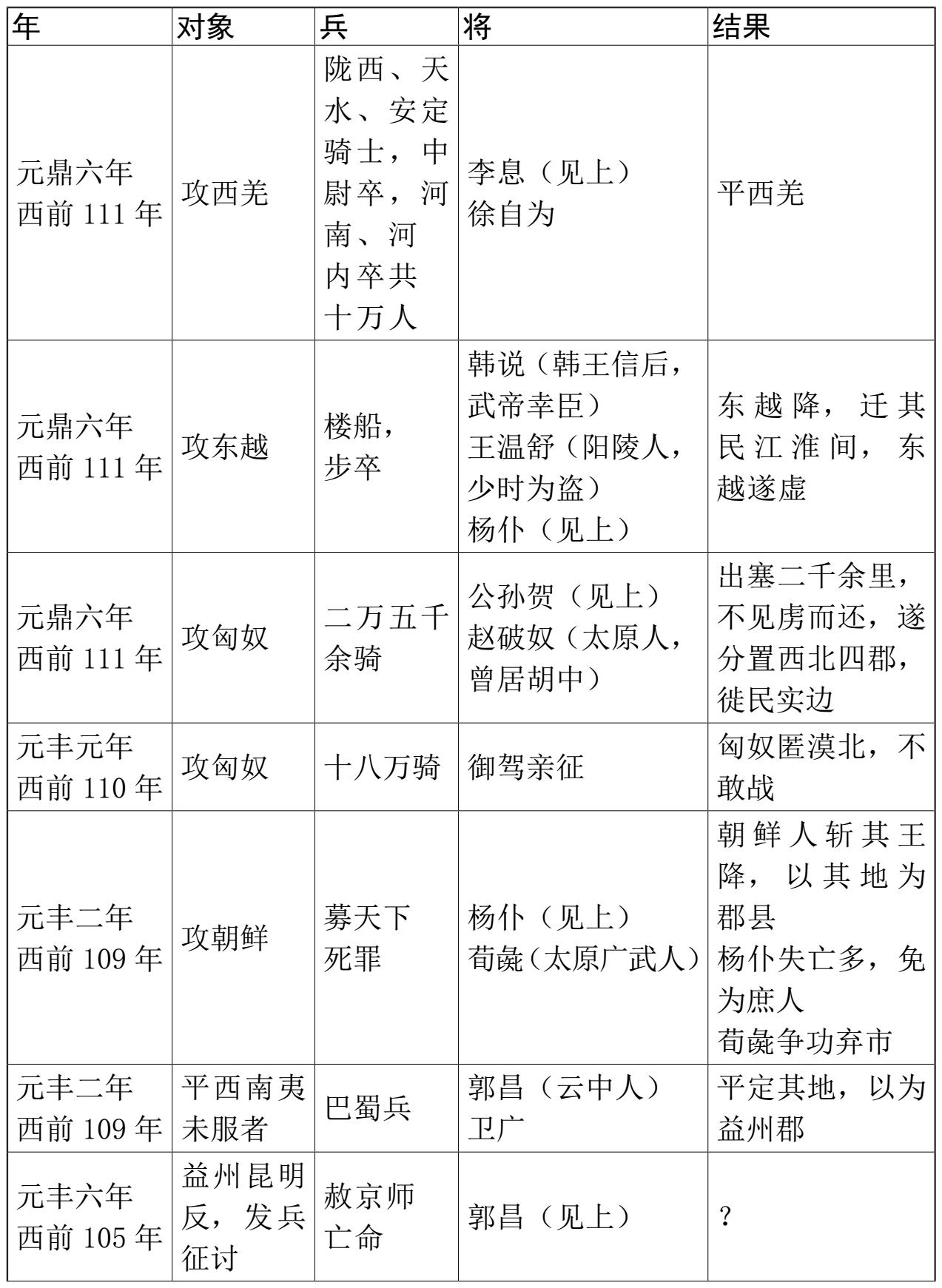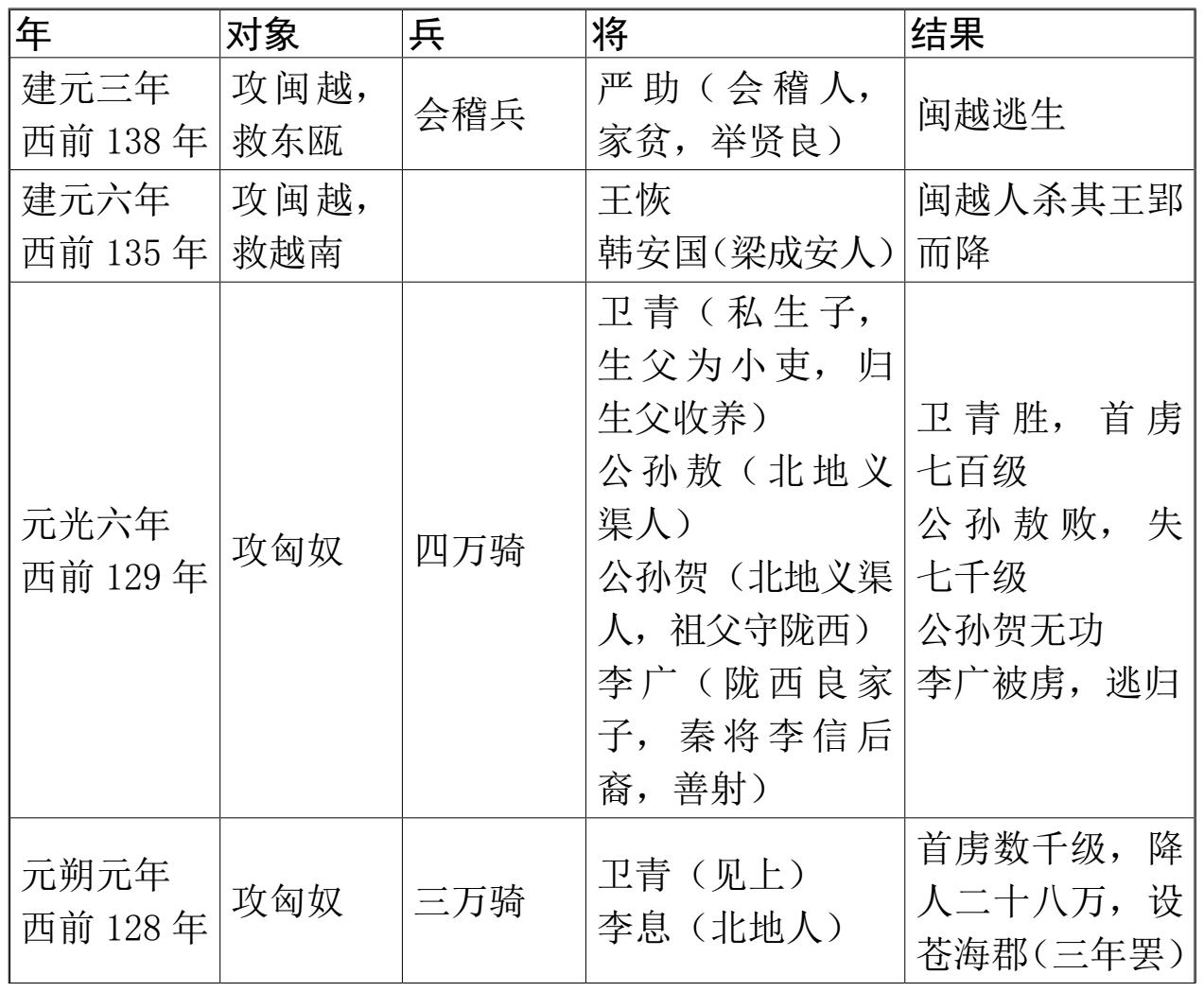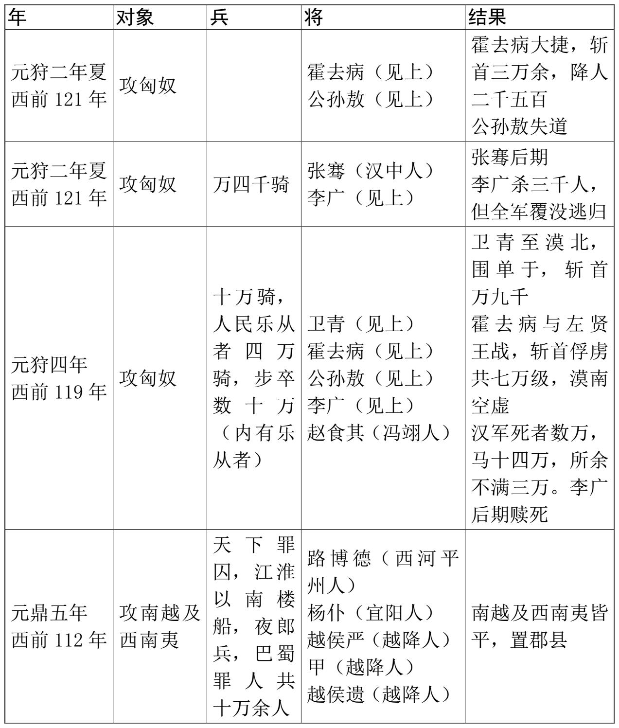 由春秋时代到汉代的发展经过,总括一句,先是军民不分,后来军民分立,最后军民对立。军民对立之下的军队最难驾御。除粮饷充足外,将才是必不可少的条件。当然任何的军队都需要有才的人率领。但真正的民兵,即或主将不得人,顶多也不过是打败仗,决不至直接祸国殃民。流浪军却非有才将率领不可,否则不止要战败辱国,并且要行动如土匪,甚至公开的变成土匪。汉武帝的伟大时代就建设在这种军力之上。武帝个人缺点虽多,却是认识人才、善用人才的明主。他能从社会各阶级中找出有才的人,并且能尽量用这些人才。我们可将武帝一代的战争列一个表,就可看出他的武功的经纬: