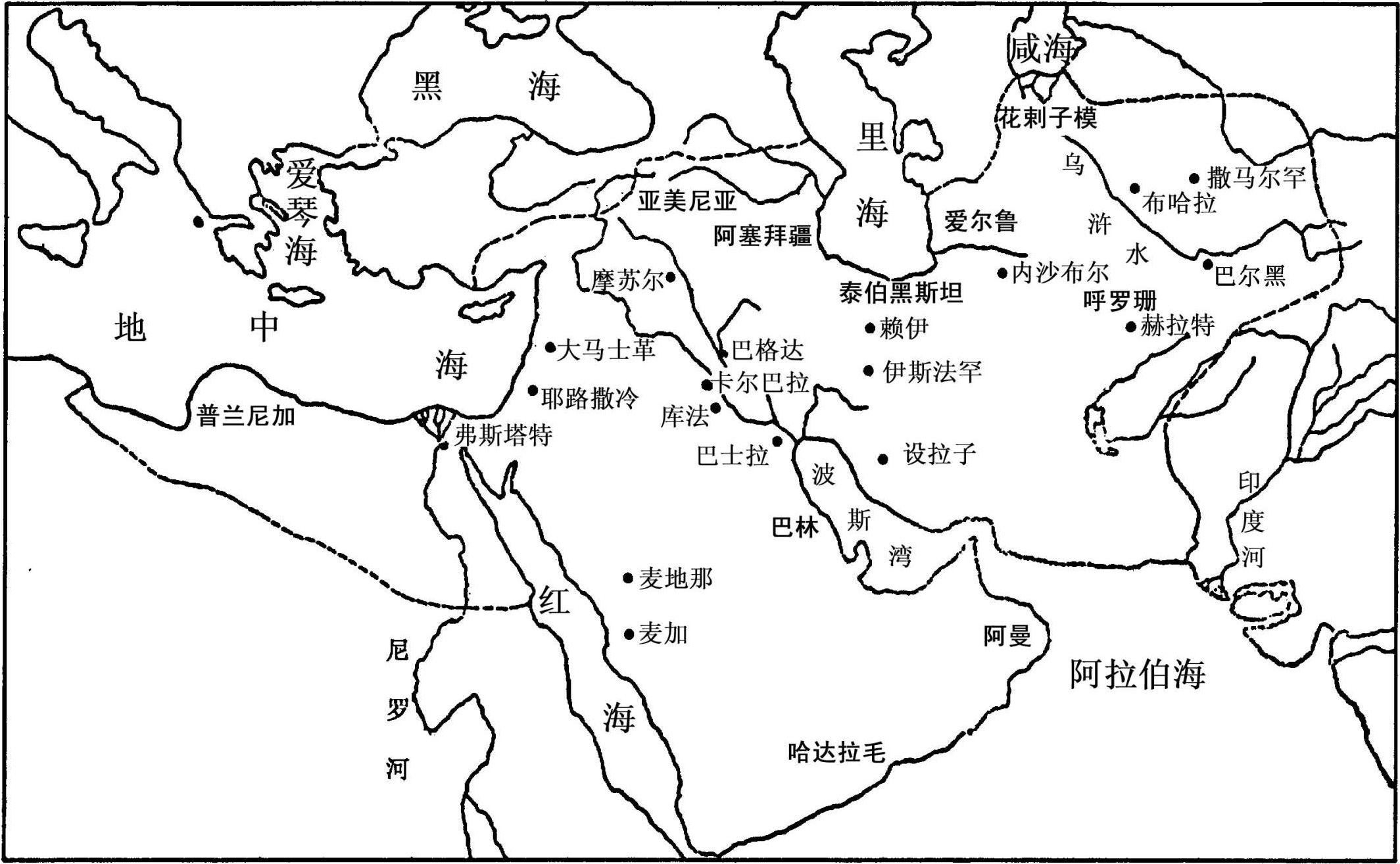 阿巴斯人统治的确立 公元750年,阿巴斯人高举还权于先知家族的旗帜,以恢复神权政体为号召,在波斯的和其他民族的马瓦里支持下,武装夺取政权,取代倭马亚人的统治,建立阿巴斯王朝(750—1258)。因其旗色尚黑,中国史称“黑衣大食”。阿巴斯人能够控制的疆域较之倭马亚人已大大缩小。