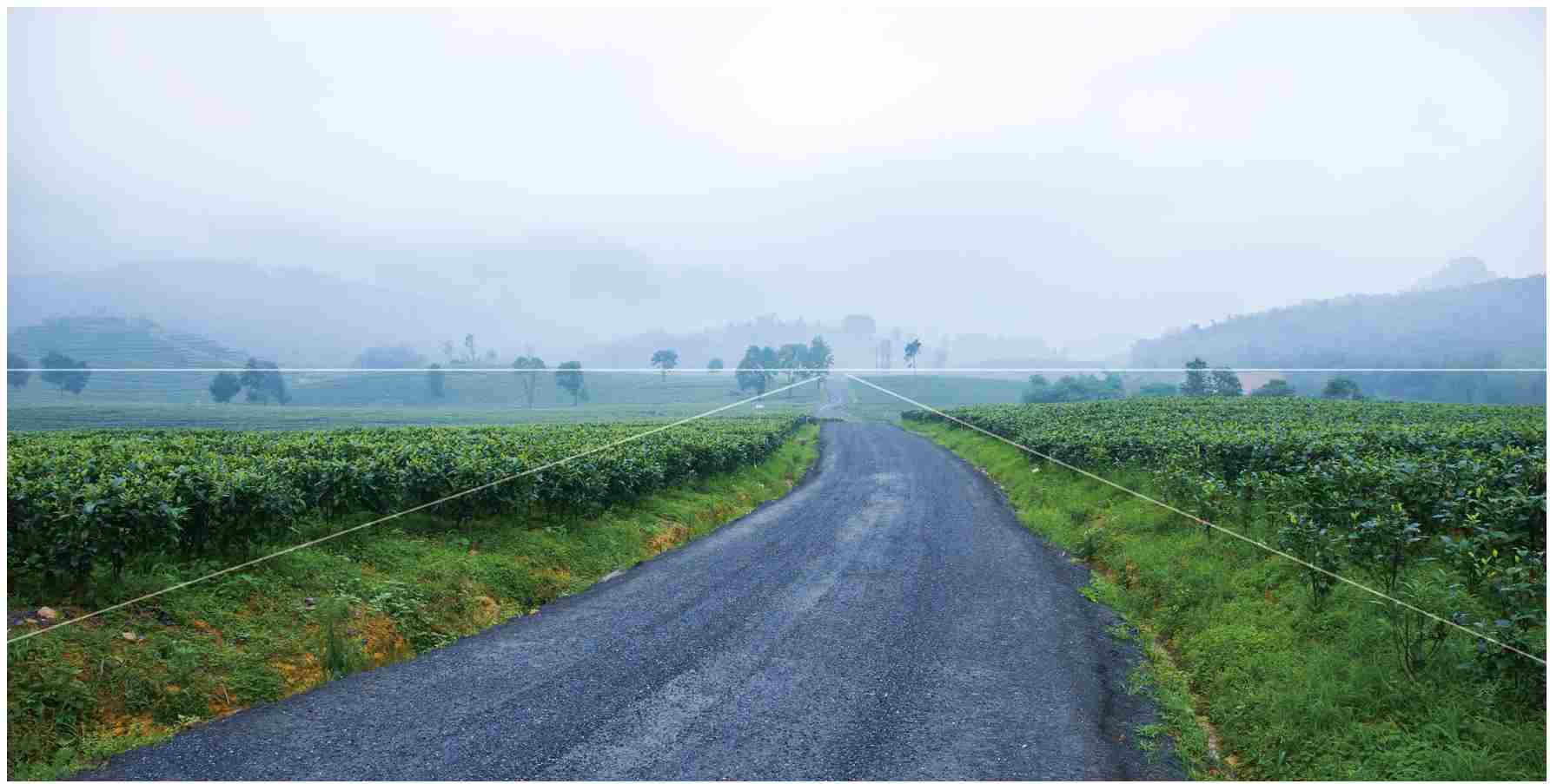 单点透视:像铁轨或两排树一样在远方的地平线消失于一个点。