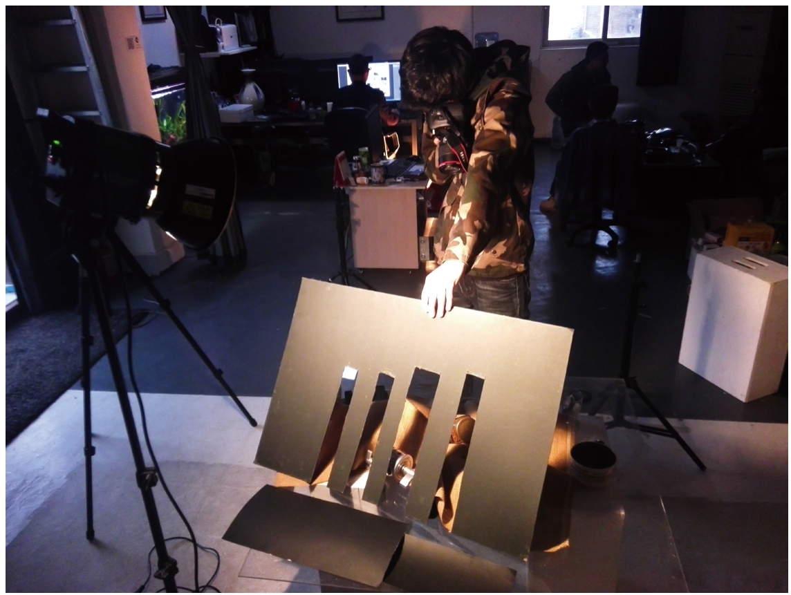 03 拍摄创意画面时,我们会自制一些灯前设备—例如用黑卡纸剪出长条形的“窗户”。