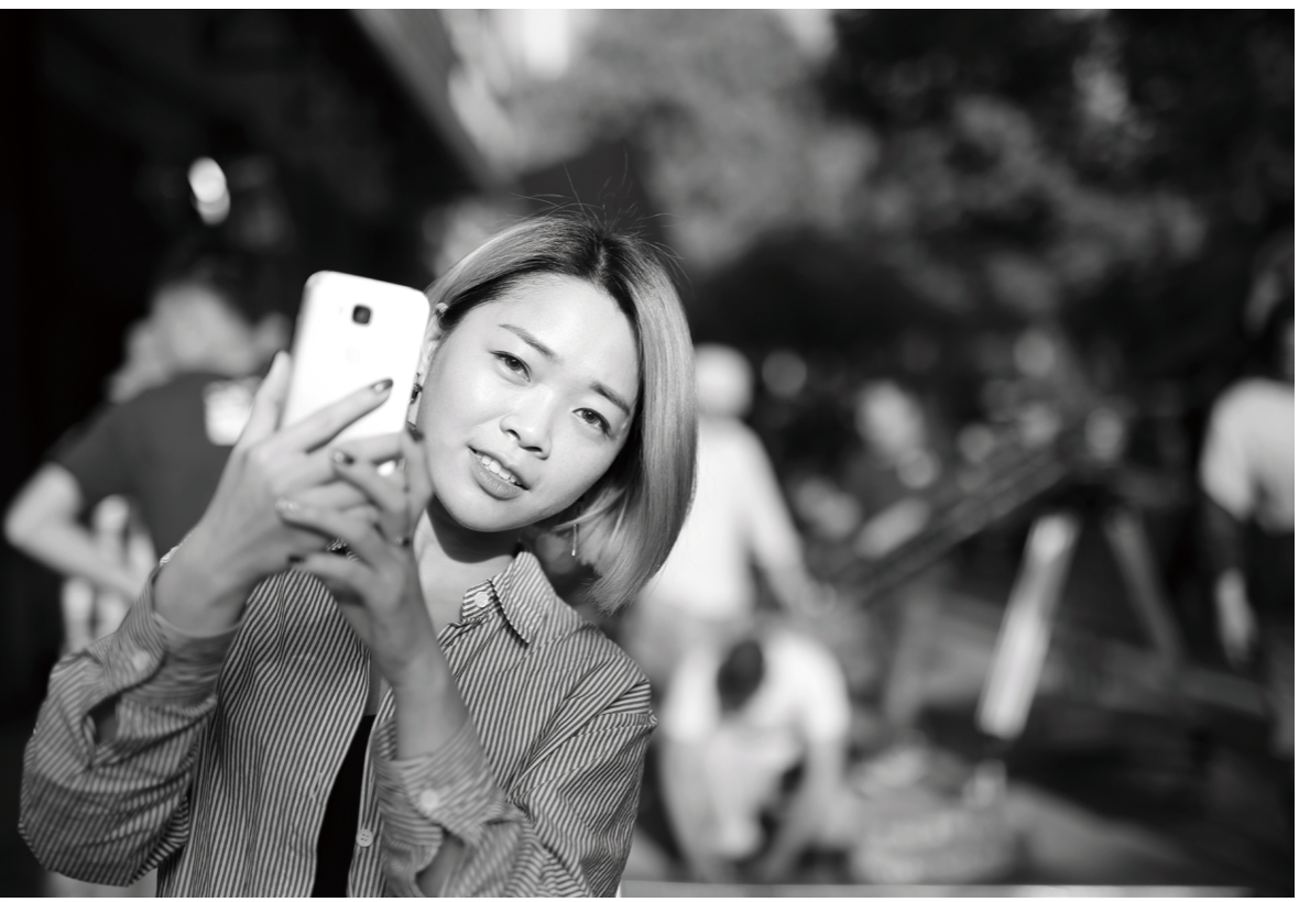 14 利用初夏下午四五点的阳光,顺光,给我们剧组(我们在拍电影)的美女化妆师李圆拍摄一张工作照。背后人物杂乱,把画面调成黑白,以减少画面干扰。