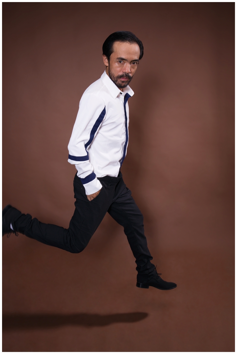 11 在影棚内拍摄创意人物肖像时,就可以自由发挥了。这是我的好友郑平导演,我用24-70mm镜头的37mm焦段拍摄他变形的动态照,以使画面更具冲击力,光圈为f/11。
