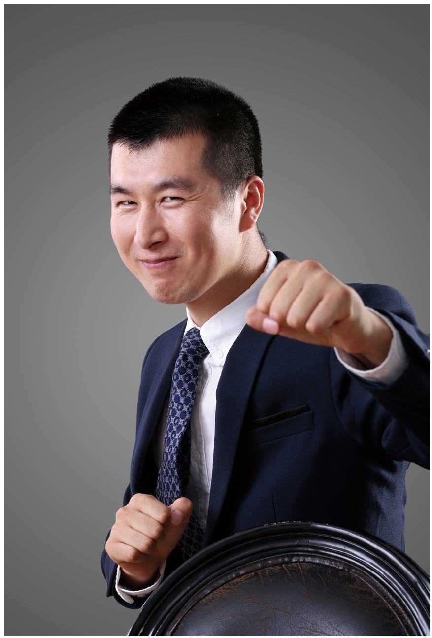 这张照片也是采用对角线对角布光方式,但这次,因为郑导比较瘦,要让他面部更丰满一些,所以把他右前方的灯拉近我,几乎是正面给他打光,这样人物的面部会显胖。