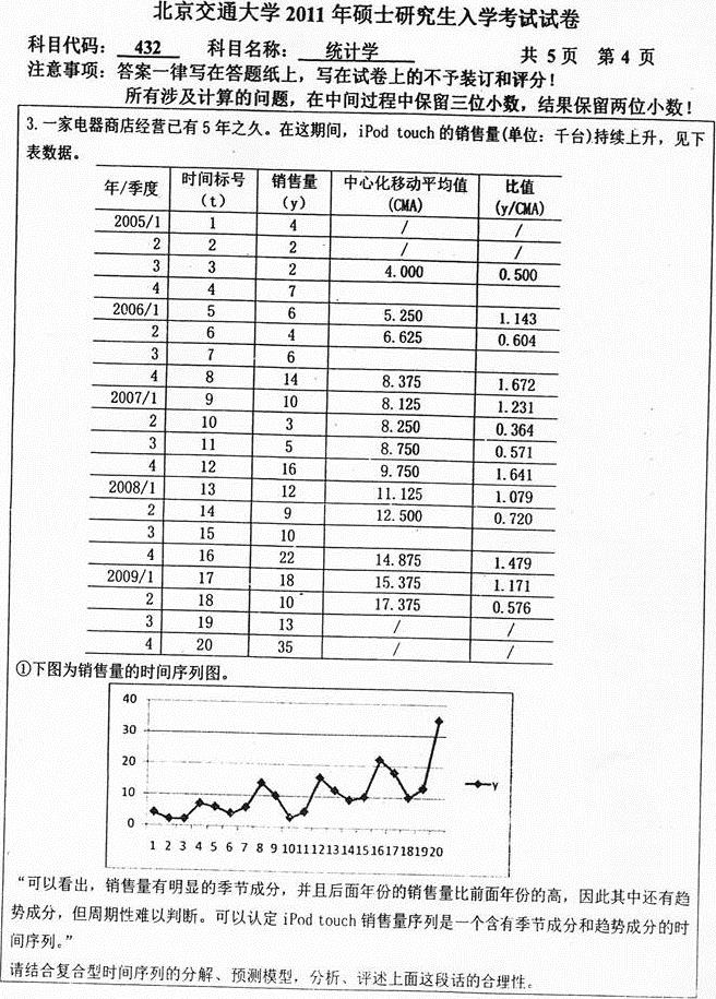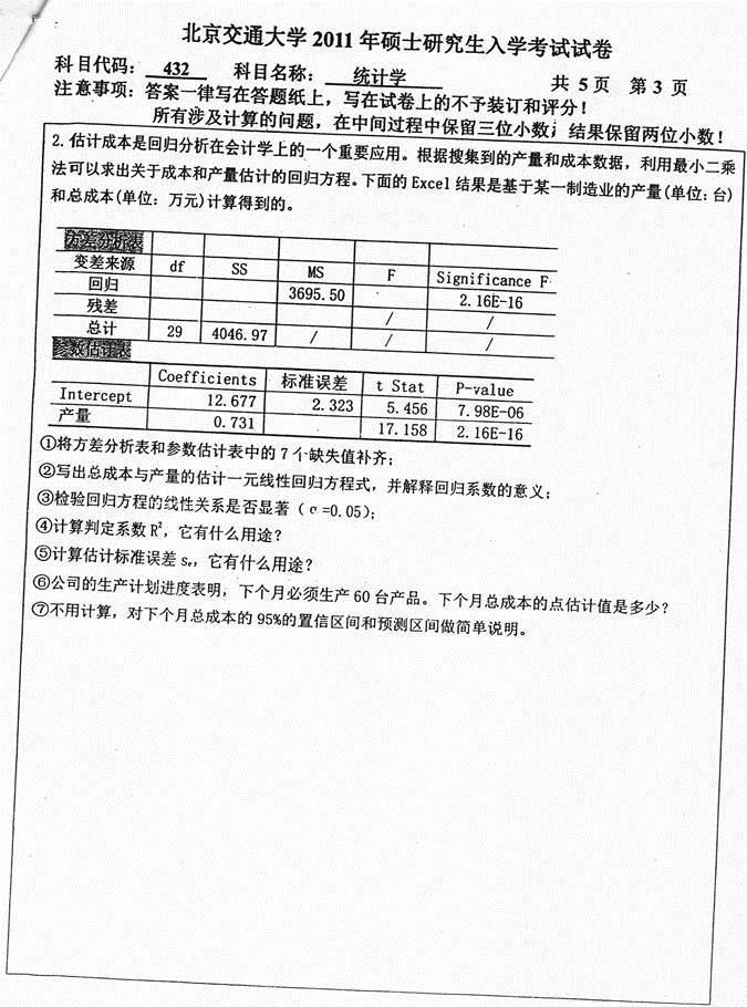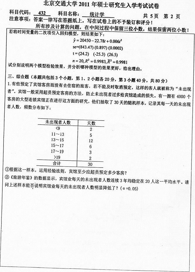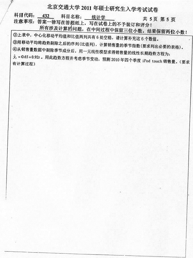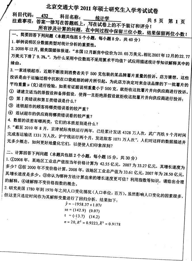 2011年北京交通大学经济管理学院432统计学[专业硕士]考研真题