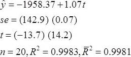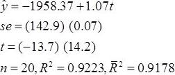 2.研究美国1780年到1970年之间人口变化情况(人口单位:百万)。虽然影响人口变化的因素很多,但这里只选定时间作为其解释变量进行了回归分析,结果如下: