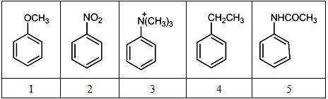 【解析】 芳香化合物发生溴化反应属于芳香亲电取代反应。因此,当苯环上的电子云密度越大时,溴化反应速率也就越快。铵正离子属于强吸电子基,甲氧基与苯环相连时给电子共轭效应大于吸电子诱导效应。根据不同基团的电子效应可以判断出溴化反应速率快慢顺序为:1>5>4>2>3。