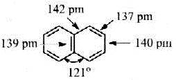 解: 萘环不是两个苯环简单地拼接而成,萘环只有十个碳原子而不是十二个,虽然萘环也是平面共轭体系,π电子可在十个碳原子上移动,但萘的键长并不等长,不像苯环一样键长平均。萘的X射线衍射数据为: