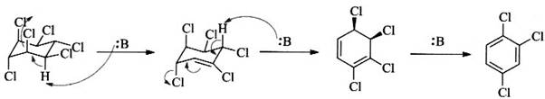 习题15-32 在动物体内,γ-六氯环己烷首先转化为1,2,4-三氯苯,接着生成三氯酚的各种异构体,并经过与葡糖醛酸结合排出体外。在昆虫体内,γ-六氯环己烷主要降解为五氯环己烯,再与谷胱甘肽形成加成产物。假定动物体内具有一定的碱性环境,画出γ-六氯环己烷转化为1,2,4-三氯苯的反应机理。